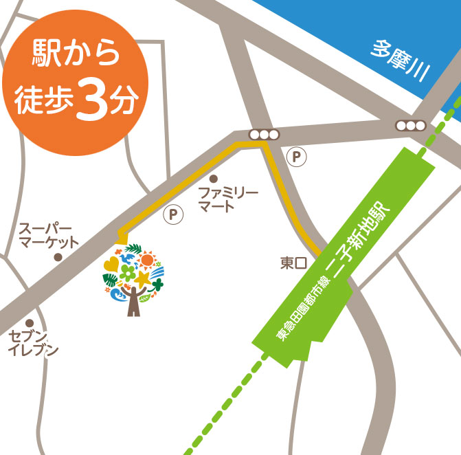 二子新地駅、東口改札を出て左折してください。