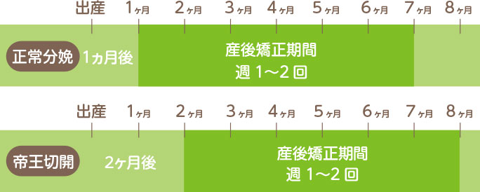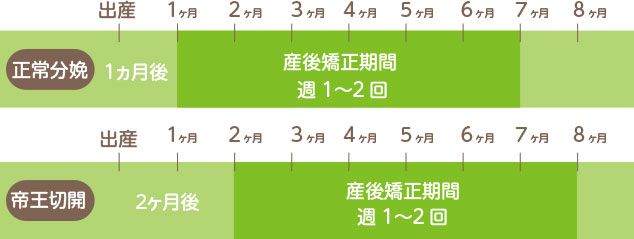 骨盤矯正に適した時期は、正常分娩の場合は産後1ヶ月頃から、帝王切開の場合は産後2ヶ月頃からが目安です。