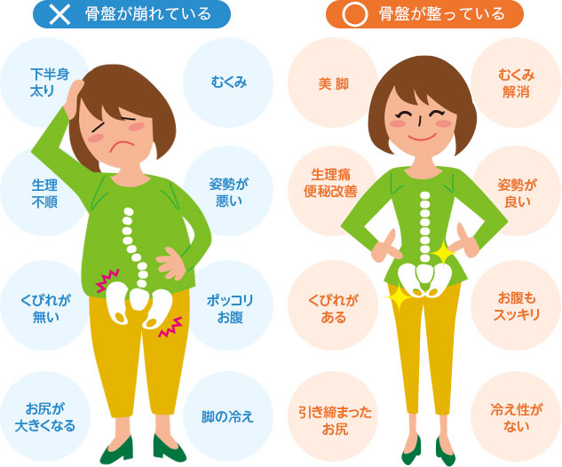 また、骨盤周囲の筋肉にも負担がかかり、産後は骨盤がゆがみやすい状態です。骨盤がゆがんだ状態が続くと、腰痛、恥骨痛や、産後太り、尿漏れなどさまざまな身体の症状を引きおこす原因となります。