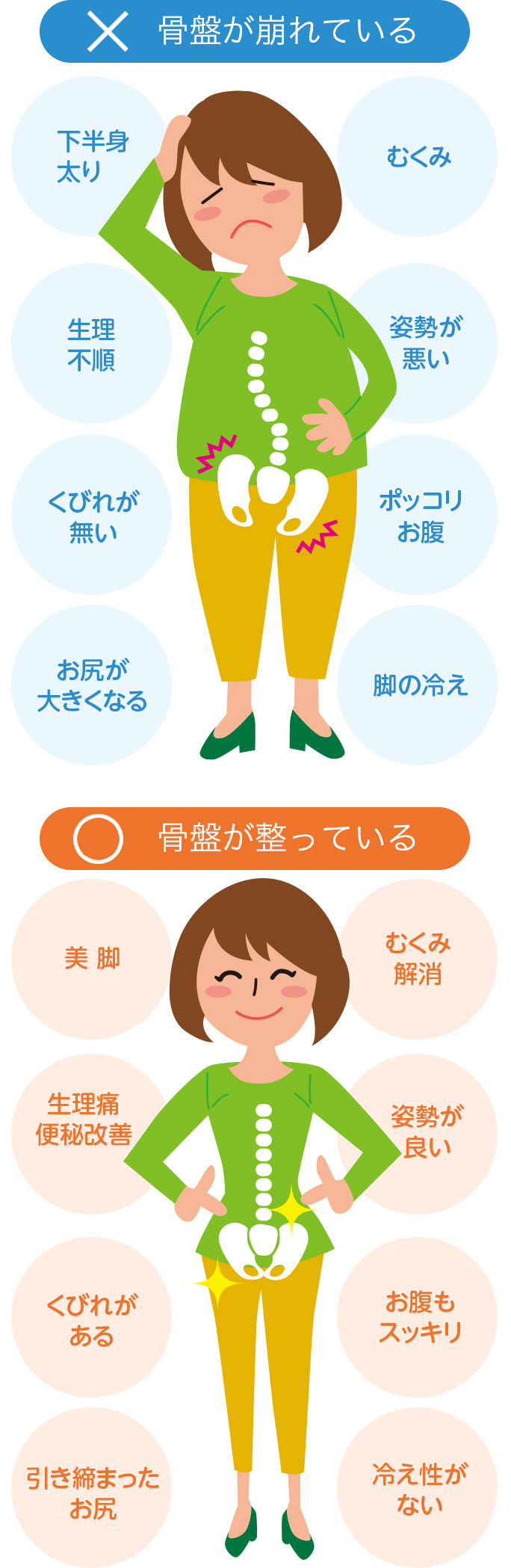 さらに産後矯正を行う事により、プロポーションだけではなく、腰痛、恥骨痛、股関節痛はもちろん生理痛、便秘改善等女性特有の悩みにも効果が期待できます。